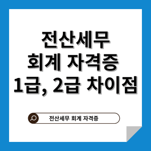 - 전산세무 1급, 2급: 회계뿐만 아니라 세무지식 요구. 세무신고 실무 능력 중심.